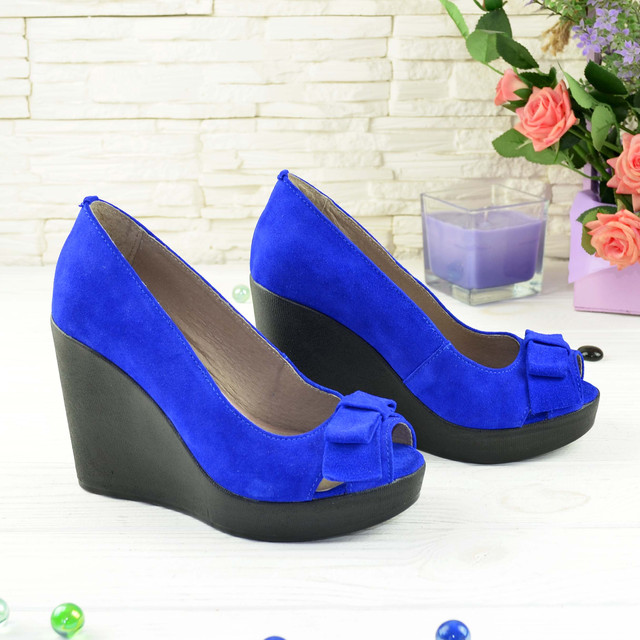 Жіночі туфлі з відкритим носком на стійкій високій платформі. Модель виготовлена з натуральної замші кольору електрик. Декоровані бантиком. Підошва лита. Розраховані на стандартну повноту ноги. Відповідають стандартній розмірній сітці. Висота платформи — 10 см, спереду — 3 см.