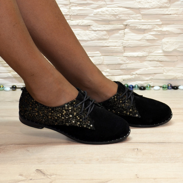 Туфлі жіночі чорні на шнурівці, низький хід. Натуральна замша та замша з лазерним напиленням