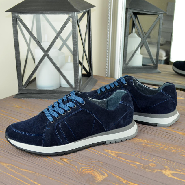 Чоловічі кросівки синього кольору, легкі та зручні, підійдуть для повсякденного використання. Виконані з натуральної замші синього кольору. Розраховані на стандартну повноту ноги. За рахунок шнурівки - підійдуть на ногу з підйомом. Усередині шкіряний одяг. Повномірні, відповідають стандартній розмірній сітці.
