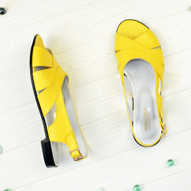 Жіночі шкіряні босоніжки на низькому ходу. Стильні і модні - добре сидять на ніжці, підошва легка і зручна. Виготовлені з натуральної шкіри жовтого кольору. Повномірні, відповідають стандартній розмірній сітці.