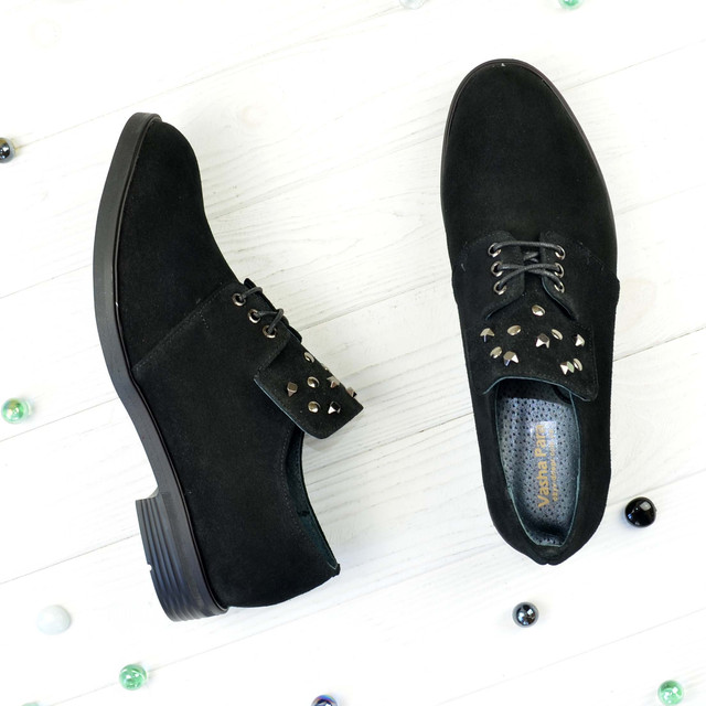 Жіночі туфлі на шнурівці з натуральної замші чорного кольору. Декоровані фурнітурою. Завдяки шнурівці підійдуть на ніжку з підйомом. Завдяки зручній колодці — підійдуть для повсякденного носіння. Чудово виглядають на ніжках! Висота каблука 2,5 см, підошви спереду 1,3 см. Усередині шкіряна підкладка. Розраховані на стандартну повноту ноги.
