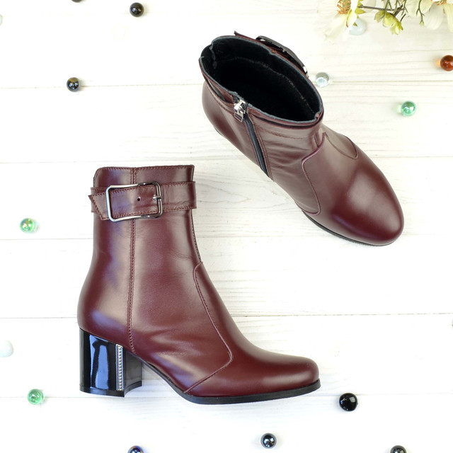 Черевики жіночі на каблуці ― виконані з натуральної шкіри бордового кольору декоровані ремінцем. Класичний пошиття завжди в моді. Підошва блок. Розраховані на стандартну повноту ноги.