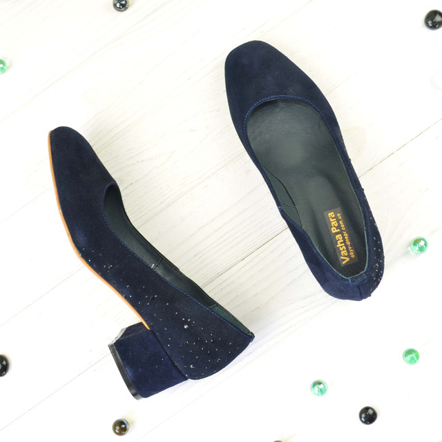 Туфлі жіночі замшеві на невисокому підборі, декоровані камінням, колір синій