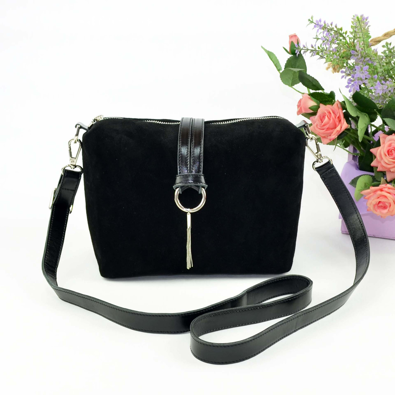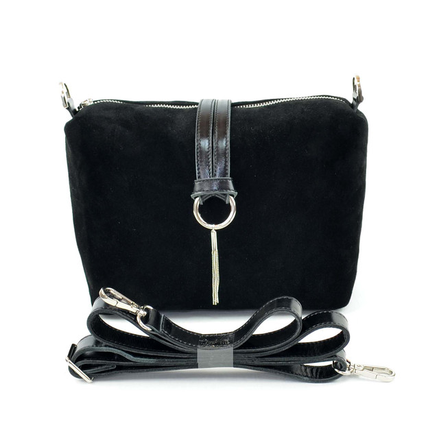 Жіноча сумка з натуральної замші чорного кольору, декорована шкіряним ремінцем і фурнітурою. Ручка виконана з натуральної шкіри, довжина регулюється. Всередині є кілька функціональних кишень.