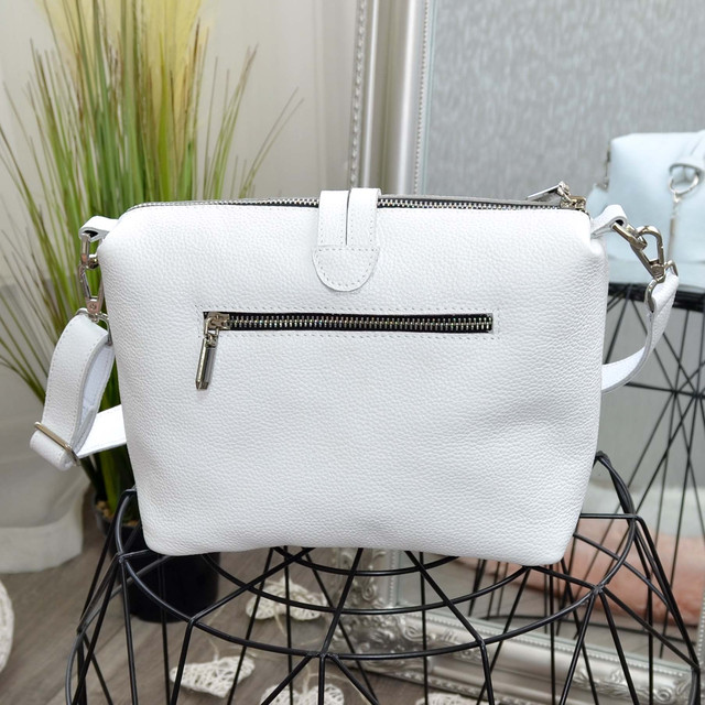 Жіноча сумка з натуральної шкіри флотар білого кольору, декорована ремінцем і фурнітурою. Ручка виконана з натуральної шкіри флотар, довжина регулюється. Всередині є кілька функціональних кишень.