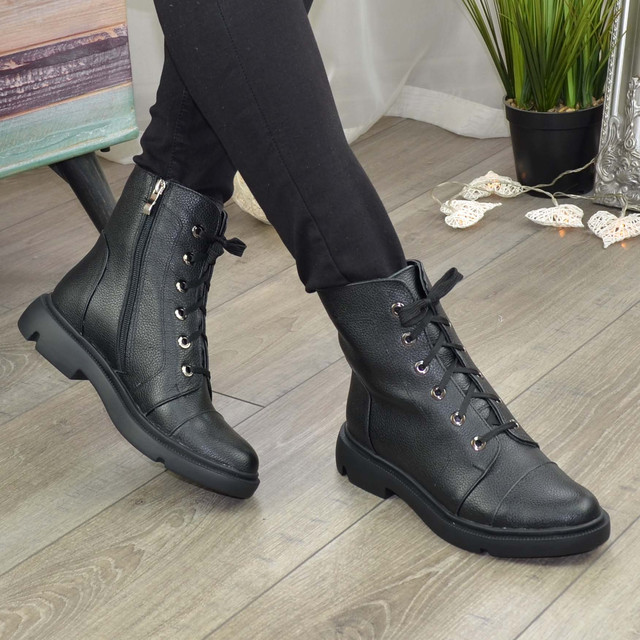 Жіночі черевики на шнурівці, виконані з натуральної шкіри флотар чорного кольору. Модель пошита в класичному стилі, зручні і акуратні ― ніжка в такому взутті не втомиться. Завдяки шнурівці підійдуть на ніжку з підйомом. Для зручності одягання передбачена блискавка. Підошва лита. Розраховані на стандартну повноту ноги.