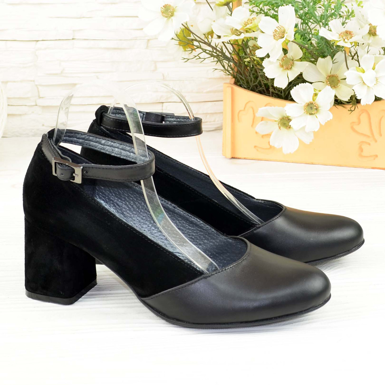 Жіночі туфлі на стійких підборах. Виготовлені з натуральної шкіри та замші чорного кольору. Модні та стильні — незамінна модель у гардеробі будь-якої жінки! Колодка зручна, стійка. Каблук обтягнутий замшею в колір самої моделі. Висота каблука 6,5-7 см (залежно від розміру). Розраховані на стандартну повноту ноги.