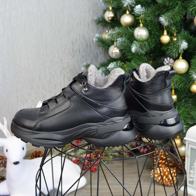 Жіночі шкіряні спортивні черевики на потовщеній підошві. Виконані з натуральної шкіри та шкіри флотар чорного кольору. Підошва міцна, зручна. Стильні та модні — добре сидять на ніжках! Розраховані на стандартну повноту ноги.