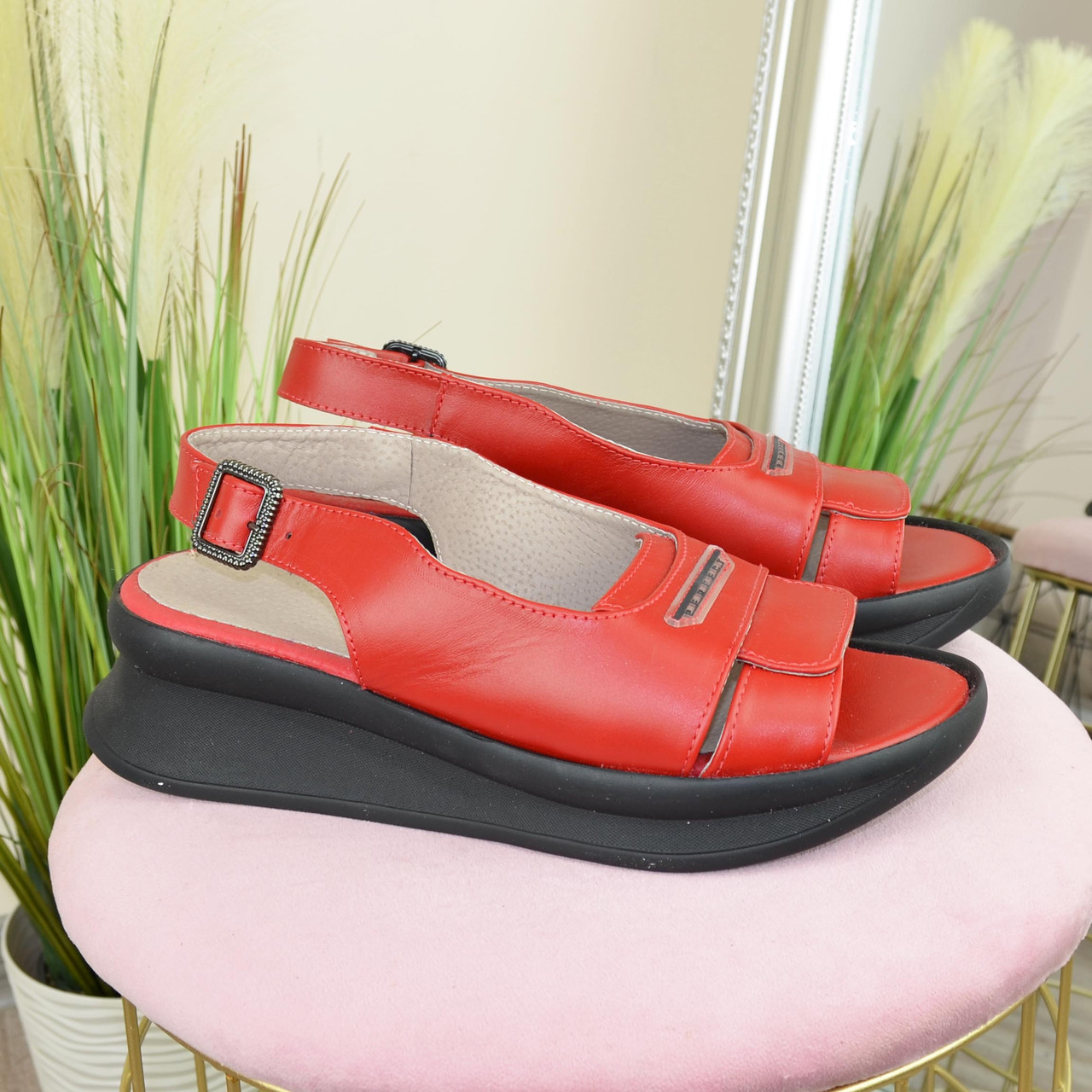 Шкіряні жіночі босоніжки на потовщеній підошві, акуратно сидять на ніжці. Молодіжна модель, зручна колодка. Декоровані силіконовими пластизолями. Висота танкетки 5,5 см, підошви спереду 2,5 см. Розраховані на стандартну повноту ноги. Виготовлені з натуральної шкіри червоного кольору.