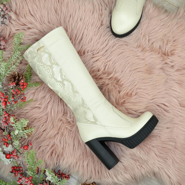 Шкіряні жіночі чоботи на високих підборах. Класична модель, завжди в моді, дуже зручні та стильні. Виготовлені з натуральної шкіри бежевого кольору та натуральної шкіри з тисненням пітон, декоровані фурнітурою. Блискавка до верху. Розраховані на середню повноту ноги.