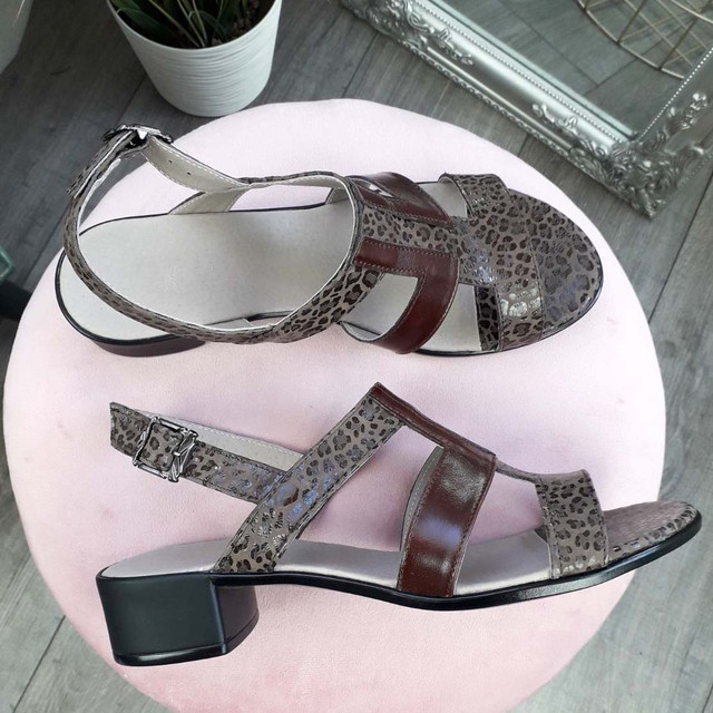Жіночі шкіряні босоніжки на підборах заввишки 3 см. Зручна колодка, акуратно сидять на ніжці. Виготовлені з натуральної шкіри з принтом леопард і натуральною коричневою шкірою. Повномірні, відповідають стандартній розмірній сітці.