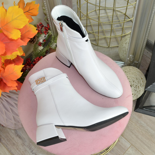 Жіночі черевики на невисокому стійкому підборі, декоровані ремінцями та фурнітурою. Акуратні, добре сидять на ніжці. Підошва блок. Каблук обтягнутий шкірою в колір самої моделі. Розраховані на стандартну повноту ноги. Виконані з натуральної шкіри білого кольору.