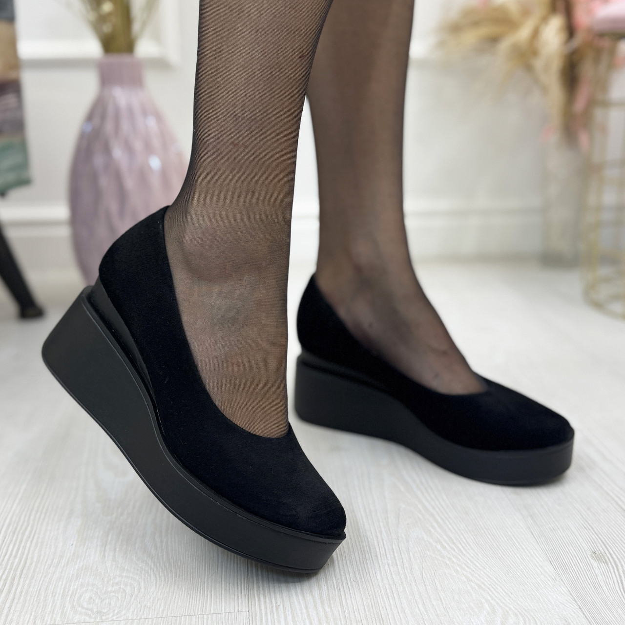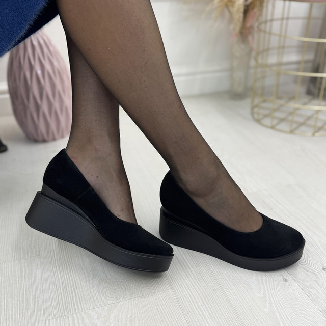 Жіночі туфлі на стійкій платформі. Чудовий офісний варіант. Модель виготовлена з натуральної замші чорного кольору. Підошва лита. Розраховані на стандартну повноту ноги. Відповідають стандартній розмірній сітці. Висота платформи 7,5 см, спереду 2,5 см.