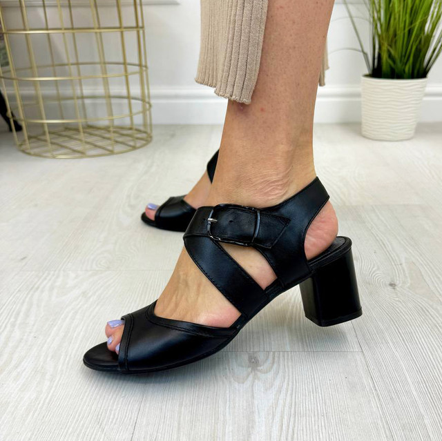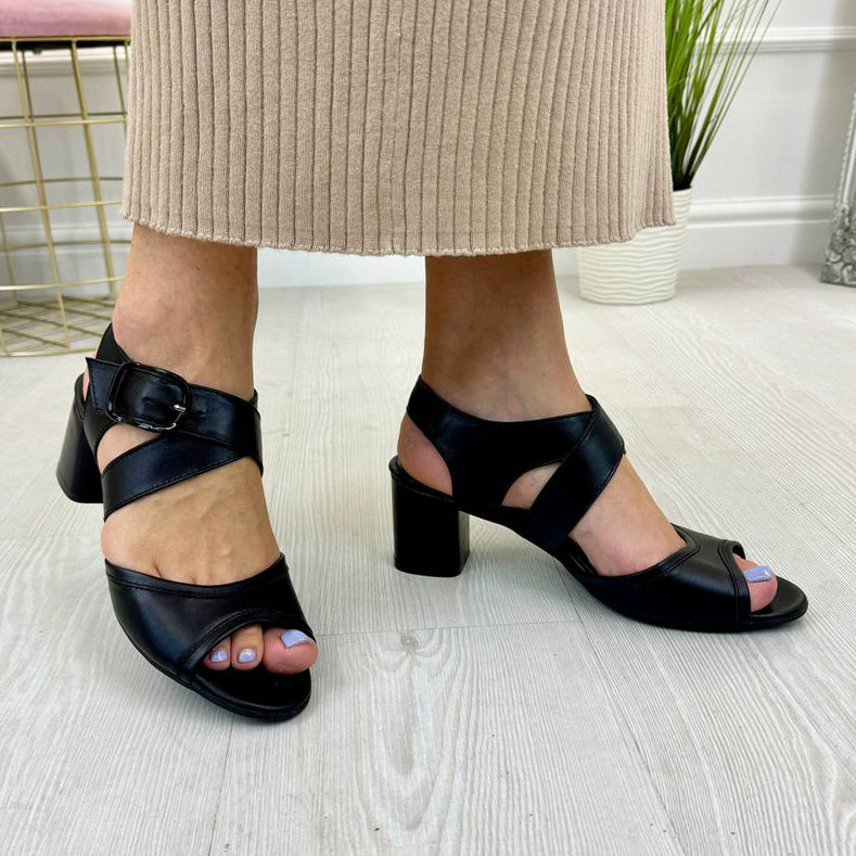 Жіночі класичні босоніжки на стійких підборах. Виконані з натуральної шкіри чорного кольору. Стильні та модні, акуратно сидять на ніжці. Підошва лита. Висота каблука 6,5 см. Розраховані на стандартну повноту ноги. Повномірні, відповідають стандартній розмірній сітці.