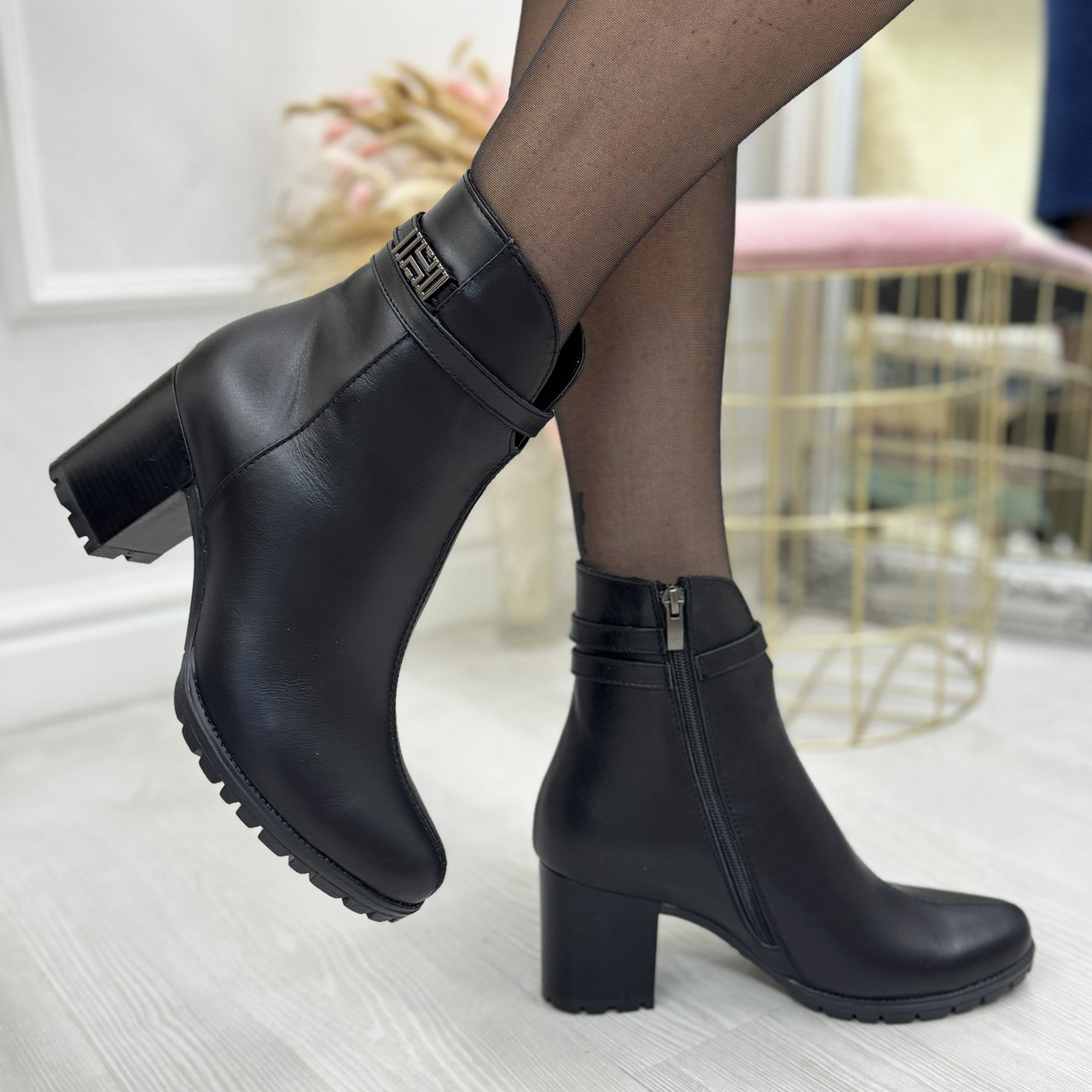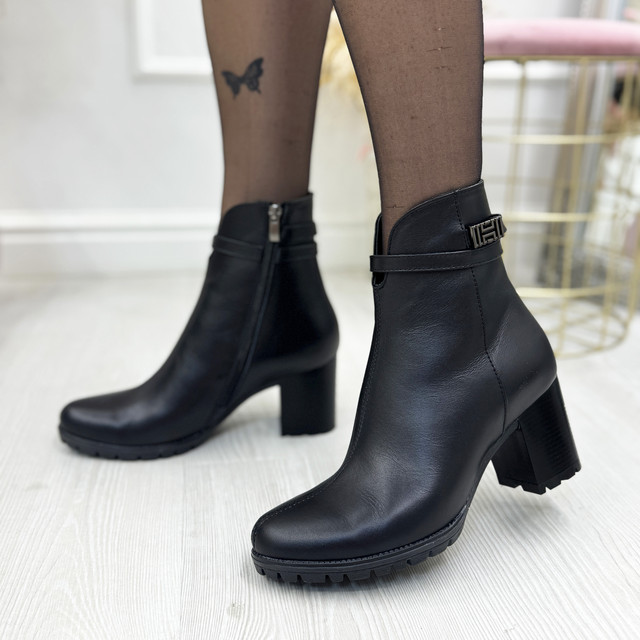 Жіночі шкіряні черевики на невисокому стійкому підборі, декоровані ремінцем і фурнітурою. Акуратні, добре сидять на ніжці. Підошва лита. Розраховані на стандартну повноту ноги. Виконані з натуральної шкіри чорного кольору.