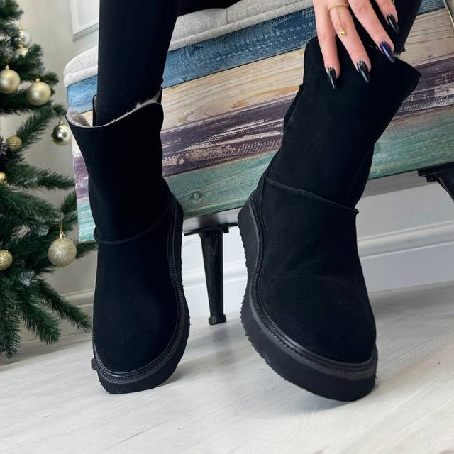 Уги стильні шкіряні на потовщеній підошві — легкі та зручні, ідеально сидять на нозі. Дуже теплі та комфортні. Підошва потовщена, міцна, практична. Виконані з натуральної замші чорного кольору.