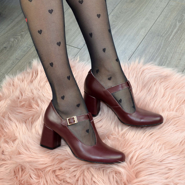 Жіночі туфлі на стійких підборах, виготовлені в класичному стилі — чудовий офісний варіант. Виготовлені з натуральної шкіри бордового кольору. Висота каблука 6,5 см. Підошва блок, каблук обтягнутий шкірою в колір самої моделі. Розраховані на стандартну повноту ноги. Відповідає стандартній розмірній сітці.