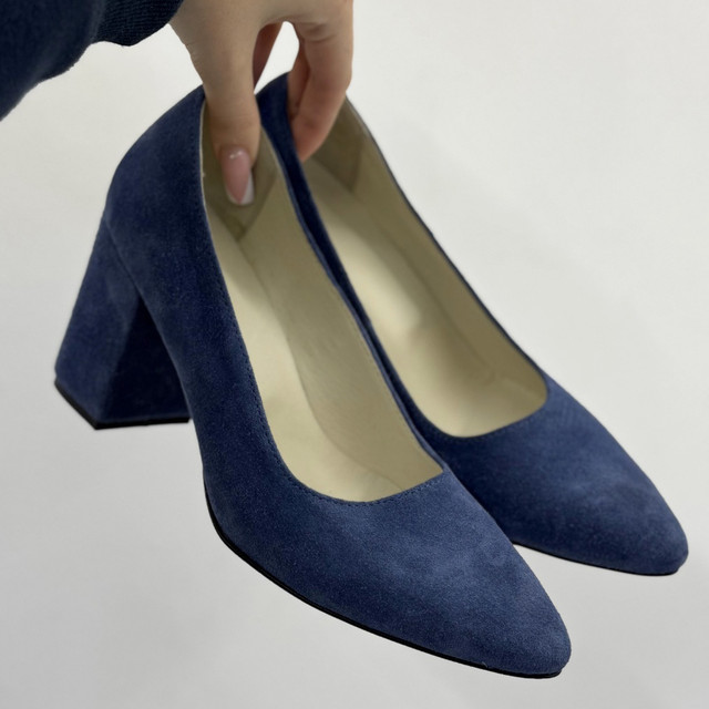 Туфлі жіночі замшеві на стійкому підборі. Класичний дизайн завжди актуальний: як в офісі, так і в повсякденному житті. Ця модель туфель розрахована на стандартну повноту ноги, акуратно виглядають і візуально зменшують ногу. Виготовлені з натуральної замші блакитного кольору. Каблук обтянут замшей у колір самої моделі. Висота каблука 8 см.