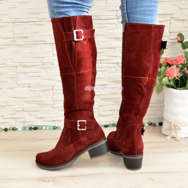 Чоботи жіночі замшеві на стійкому каблуці. Підошва лита, антиковзка. Жіночі замшеві чоботи, ― комфортні зручні чоботи, виконані з натуральної бордовою замші, стійкий широкий каблук, лита підошва.