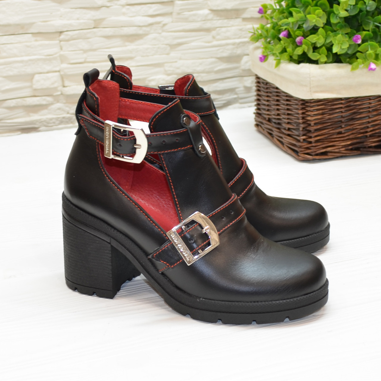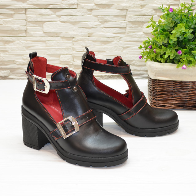 Жіночі шкіряні ботильйони на стійкому каблуці, декоровані шкіряними ремінцями і фурнітурою. Акуратні, добре сидять на ніжці. Завдяки ремінцю регулюється обхват щиколотки. Підошва лита. Розраховані на стандартну повноту ноги.