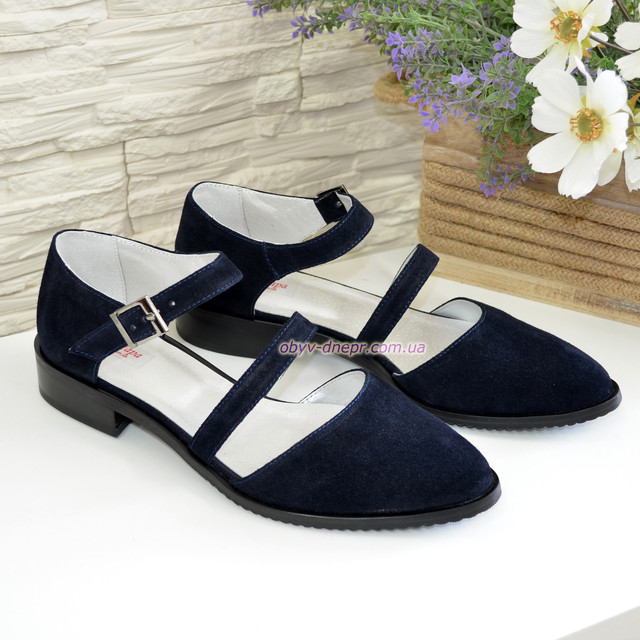 Сині замшеві відкриті туфлі на класичній підошві. Модель дуже зручна, на низькому ходу, стильні і акуратні. Виконані з натуральної замші синього кольору. Розраховані на середню повноту ноги.
