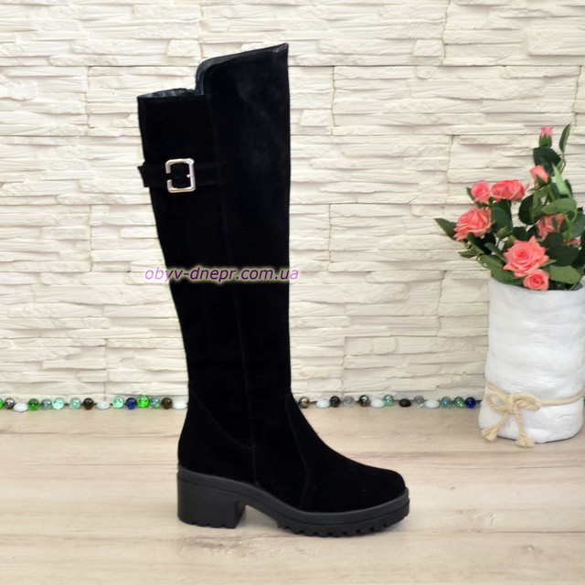 Жіночі чорні замшеві чоботи на стійкому каблуці. Модель виготовлена в класичному стилі, декоровані ремінцем. Міцна підошва, лита, відмінний варіант ― у такому взутті Ваші ніжки будуть відчувати себе зручно і комфортно! Розраховані на стандартну повноту ноги.